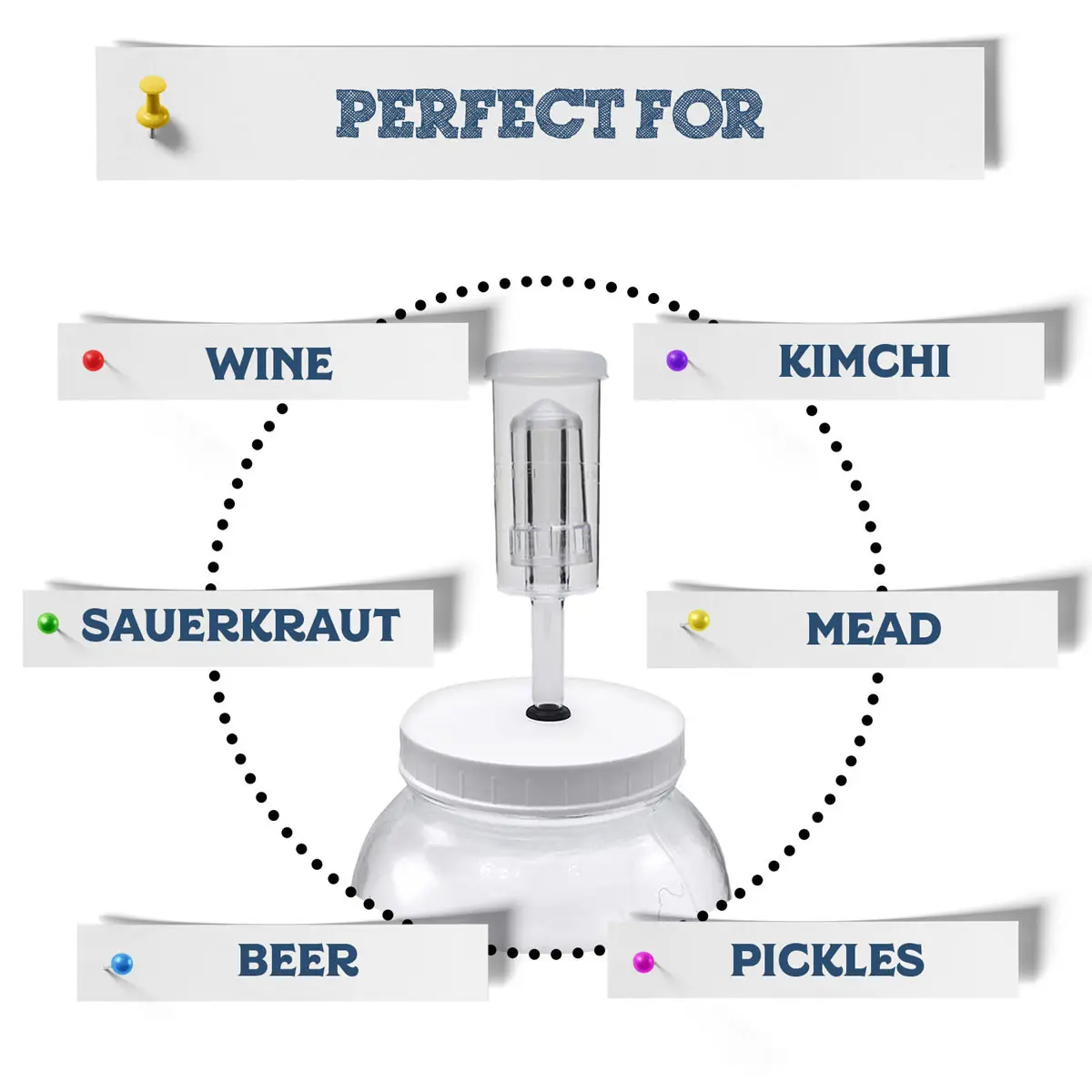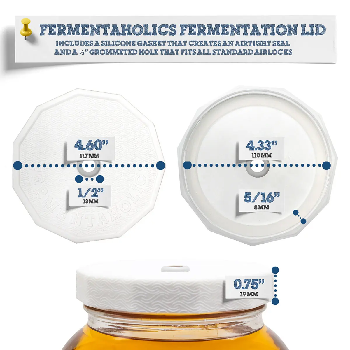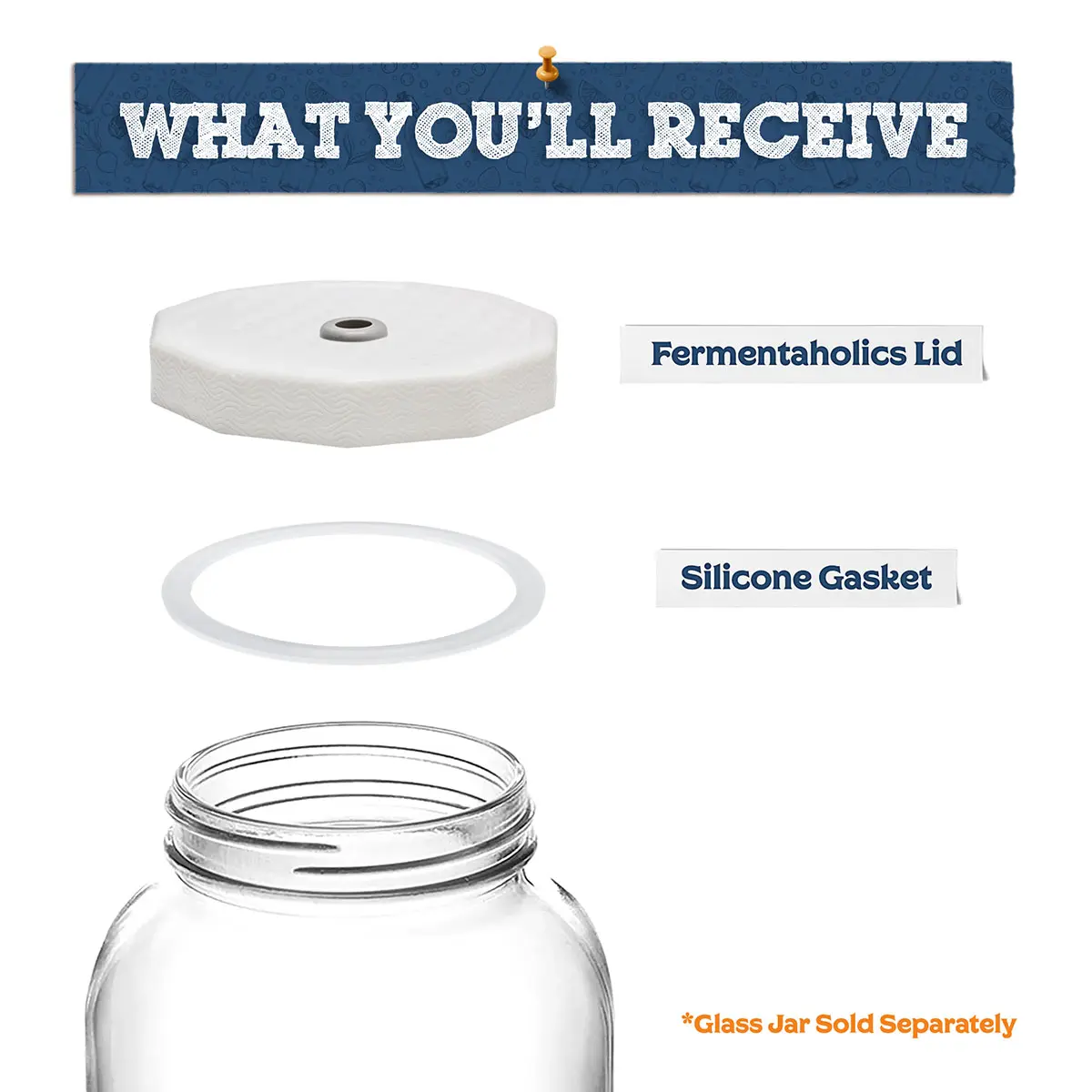 Upgrade your fermenter with our Gallon Jar Fermentation Lid. When paired with an airlock, these lids are designed to allow gases to escape during the fermentation process while preventing contaminants from entering the container. This lid is great for making fermented foods and beverages like sauerkraut, kimchi, beer, wine, cider hard kombucha, and pickles. The airtight seal ensures a controlled fermentation process by allowing carbon dioxide to escape without letting in contaminants. Made from durable, BPA-free materials, this lid is built for longevity and repeated use. Its pristine white design acts not just as a functional tool but also as a stylish addition to your kitchen.