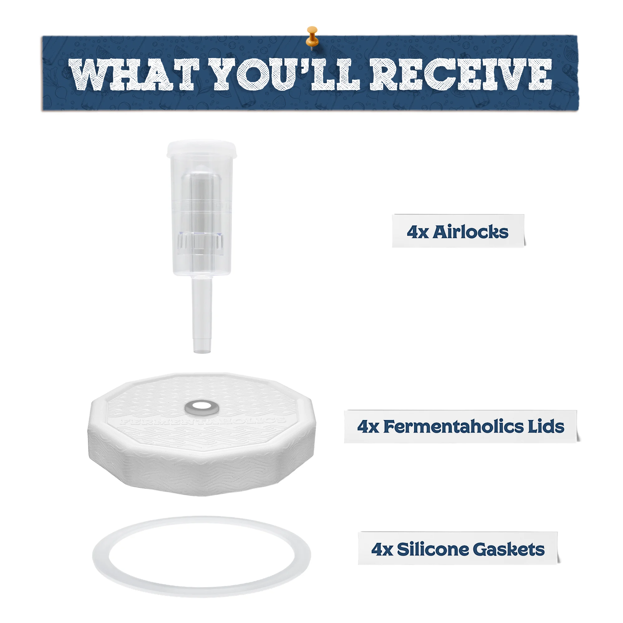 This 4-pack fermentation lid set is made to fit standard 86mm wide-mouth mason jars and includes everything you need to get started fermenting right away. Each lid comes with a pre-installed silicone gasket and grommet, along with a 3-piece airlock. The setup takes less than a minute, turning your existing mason jars into reliable fermenters.