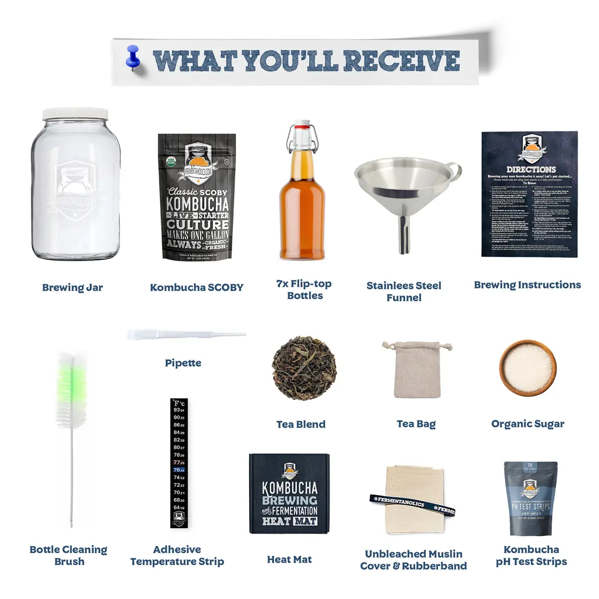 As the highest quality kombucha kit on the market, the Fermentaholics Complete Kombucha Kit has everything you need. Purchase includes equipment, ingredients, instructions, brewing support, and education.