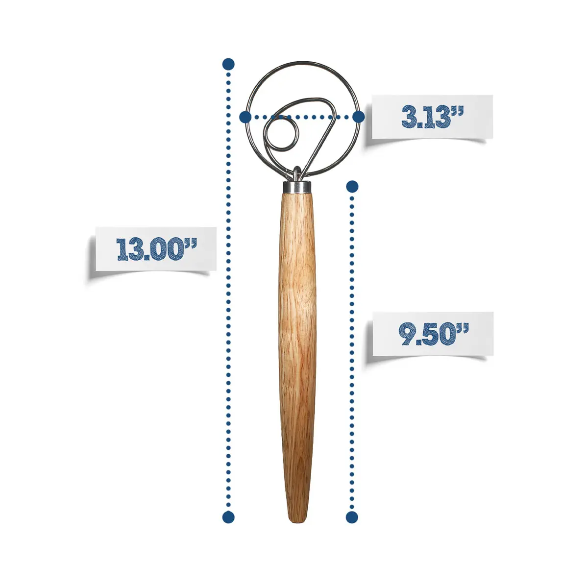 The Fermentaholics Danish Dough Whisk is an essential baking tool for bakers. Designed to tackle the challenge of mixing thick or heavy dough, this three-looped head dough hook provides a superior mixing effect unmatched by traditional kitchen utensils. This whisk efficiently cuts through the dough, blending ingredients thoroughly without overworking the mixture, preserving the texture and quality of your baked goods. The wooden handle ensures a comfortable, secure grip, making the process of mixing dough less tiring and more enjoyable. Made from high-quality, food-grade stainless steel, this whisk is durable and rust-proof and made for long-term use. Its compact one-piece design makes it both portable and easy to clean. A perfect blend of functionality, quality, and design, this Danish Dough Whisk is a must-have for anyone passionate about baking.