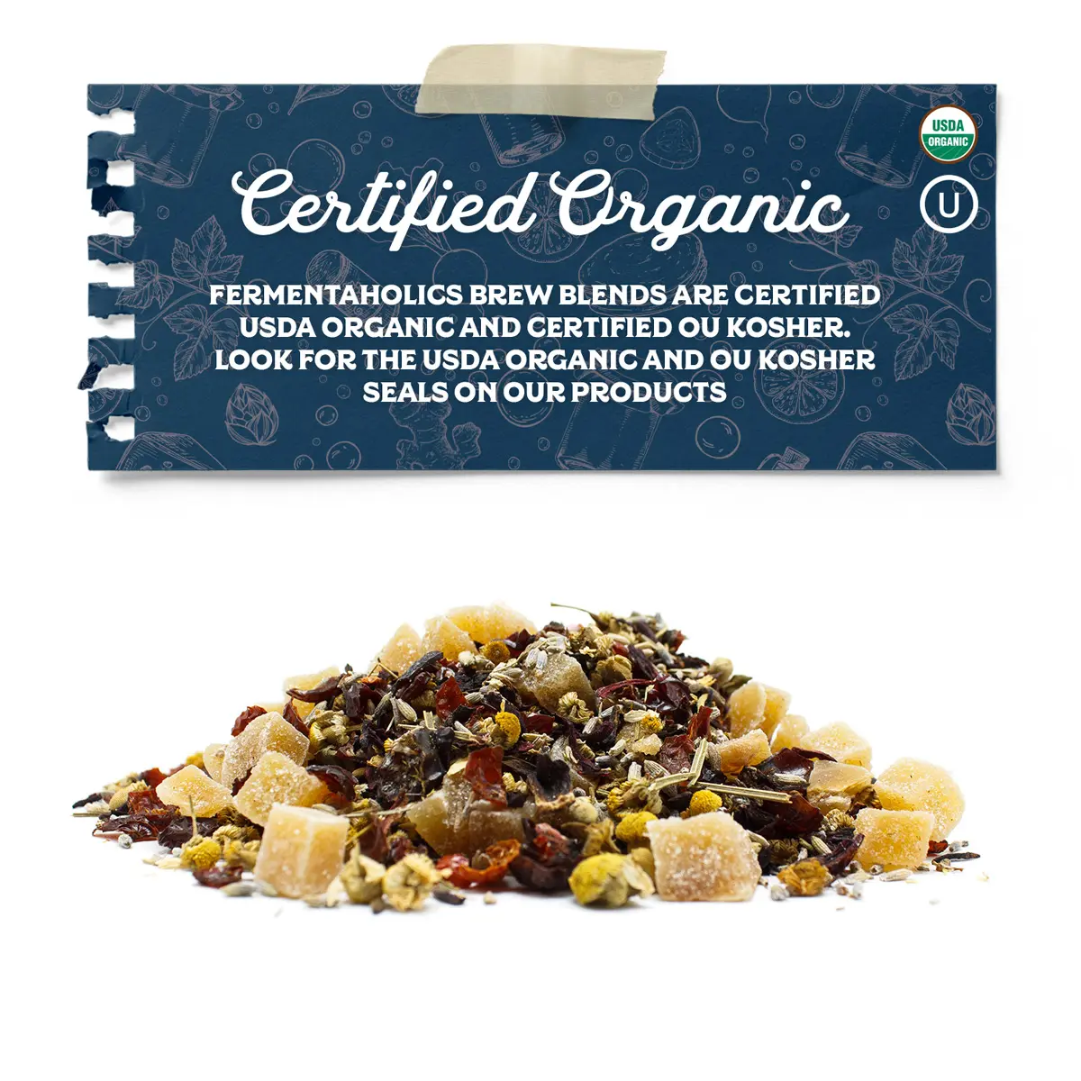 An organic blend of ginger, rose hips, hibiscus, lavender, and chamomile for flavoring kombucha, water kefir, tea, and other fermented beverages.