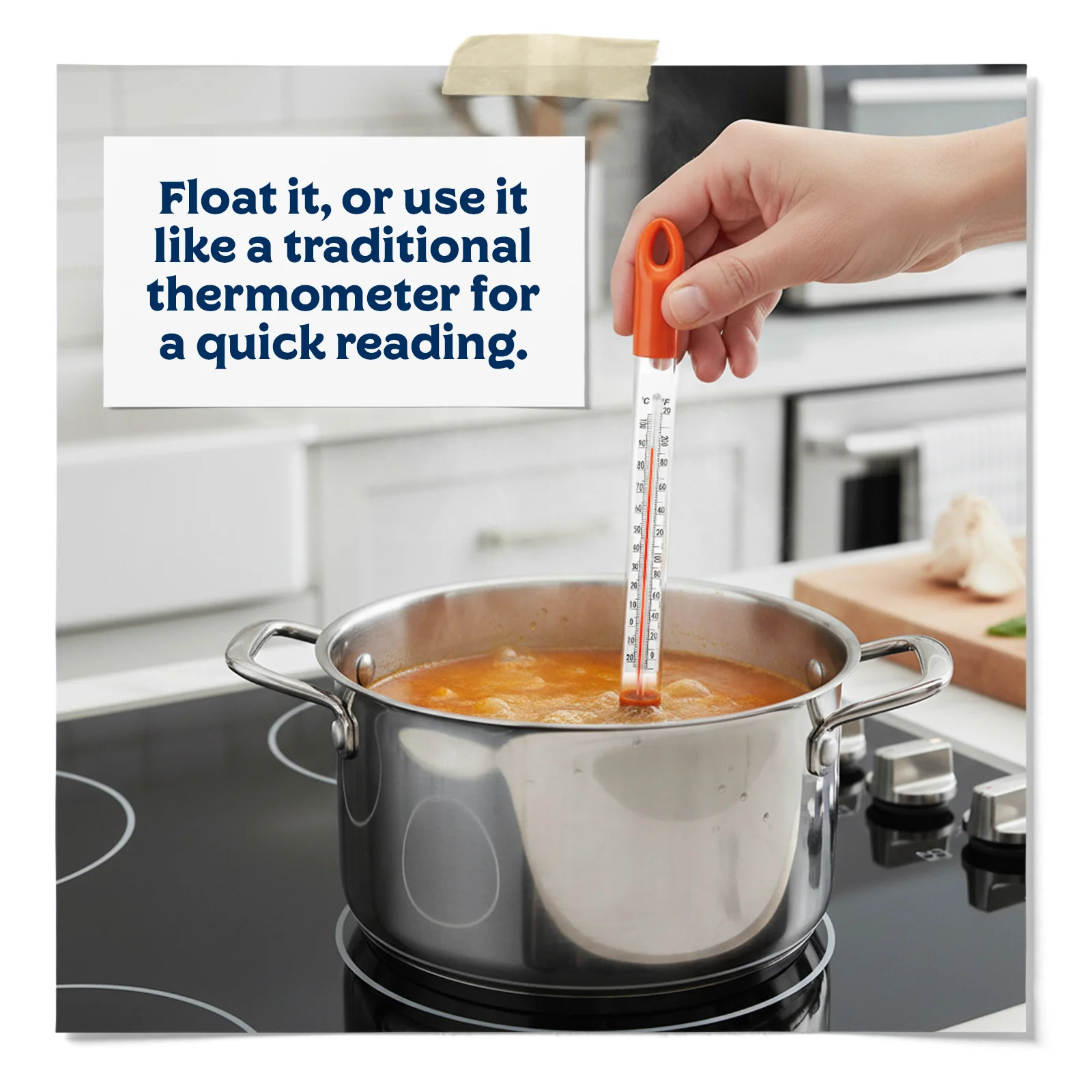 You can float it upright in a pot when the liquid is deep enough—or use it like a standard kitchen thermometer by holding or leaning it. It’s useful for everyday cooking jobs like checking soup or tea temperature and also works well for brewing beer, making cheese, or pasteurizing milk.