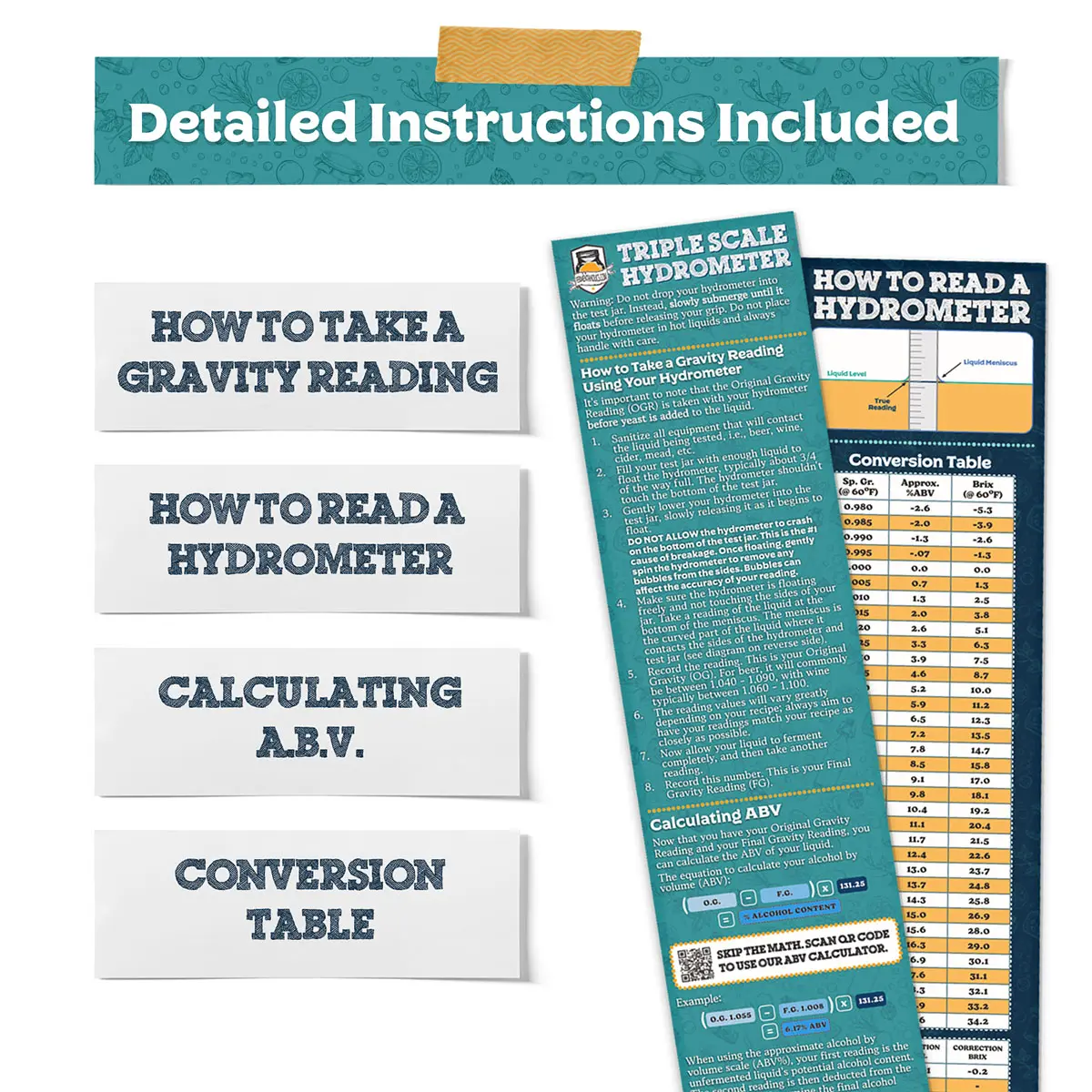 This Triple Scale Hydrometer is the used to measure specific gravity, brix, and potential alcohol percentage in your brew. Hydrometer readings can also be used to determine alcohol content by taking a reading before and after fermentation. In addition, it can be used to monitor the progression of fermentation in your wine, beer, hard kombucha, cider, and more! The package comes with a triple scale hydrometer, a step-by-step direction guide on how to do gravity readings and use your hydrometer, and a conversion table. The conversion table helps you understand all three scales, including specific gravity of liquids, BRIX (sugar content), and potential alcohol.