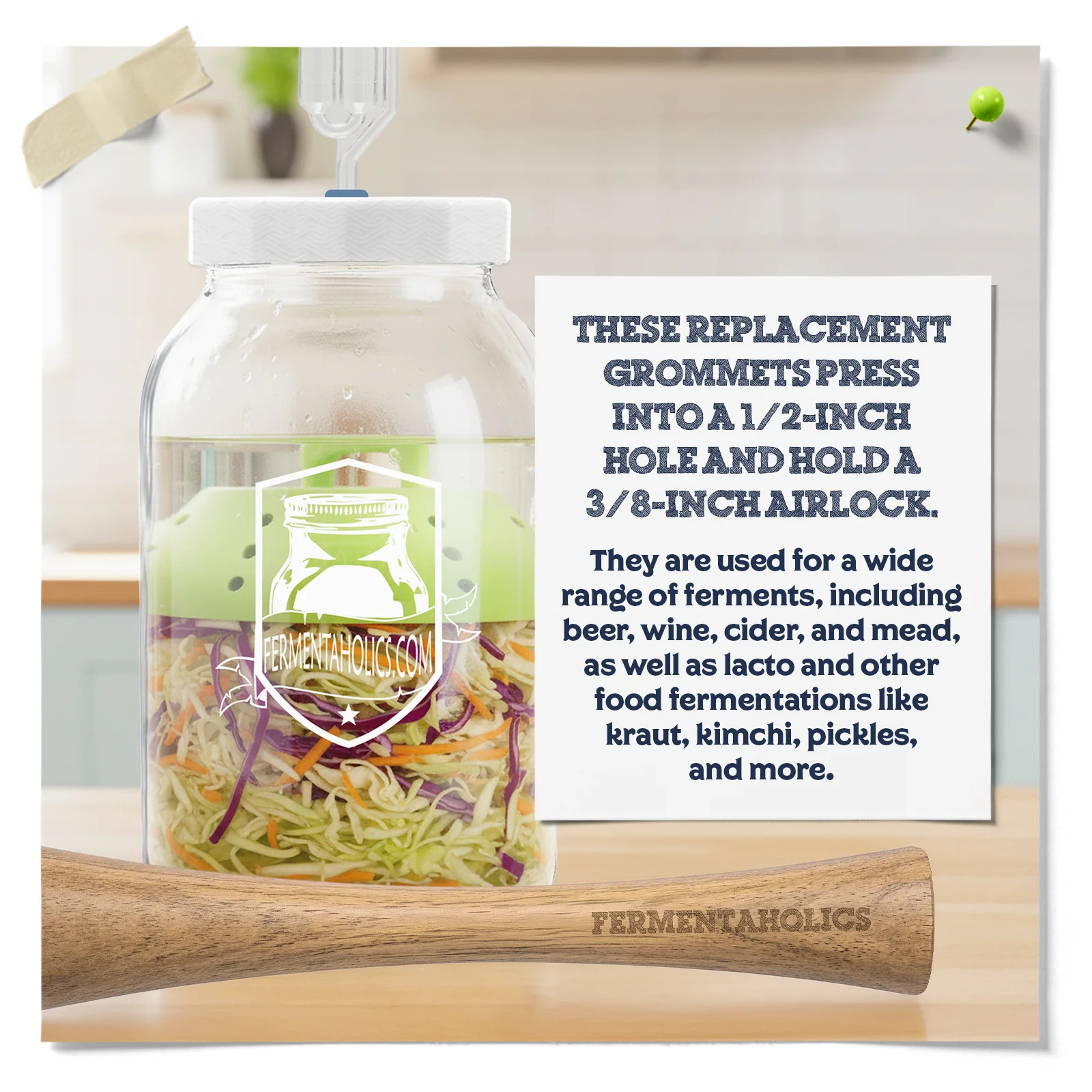 Fermentaholics Airlock Fermentation Replacement Grommets are designed to securely hold standard fermentation airlocks in place on fermenter lids, creating a reliable seal during fermentation. Each grommet fits a 1/2 inch hole and is compatible with standard 3/8 inch airlocks, including 3-piece, Double Bubble, and S-style airlocks commonly used in homebrewing.