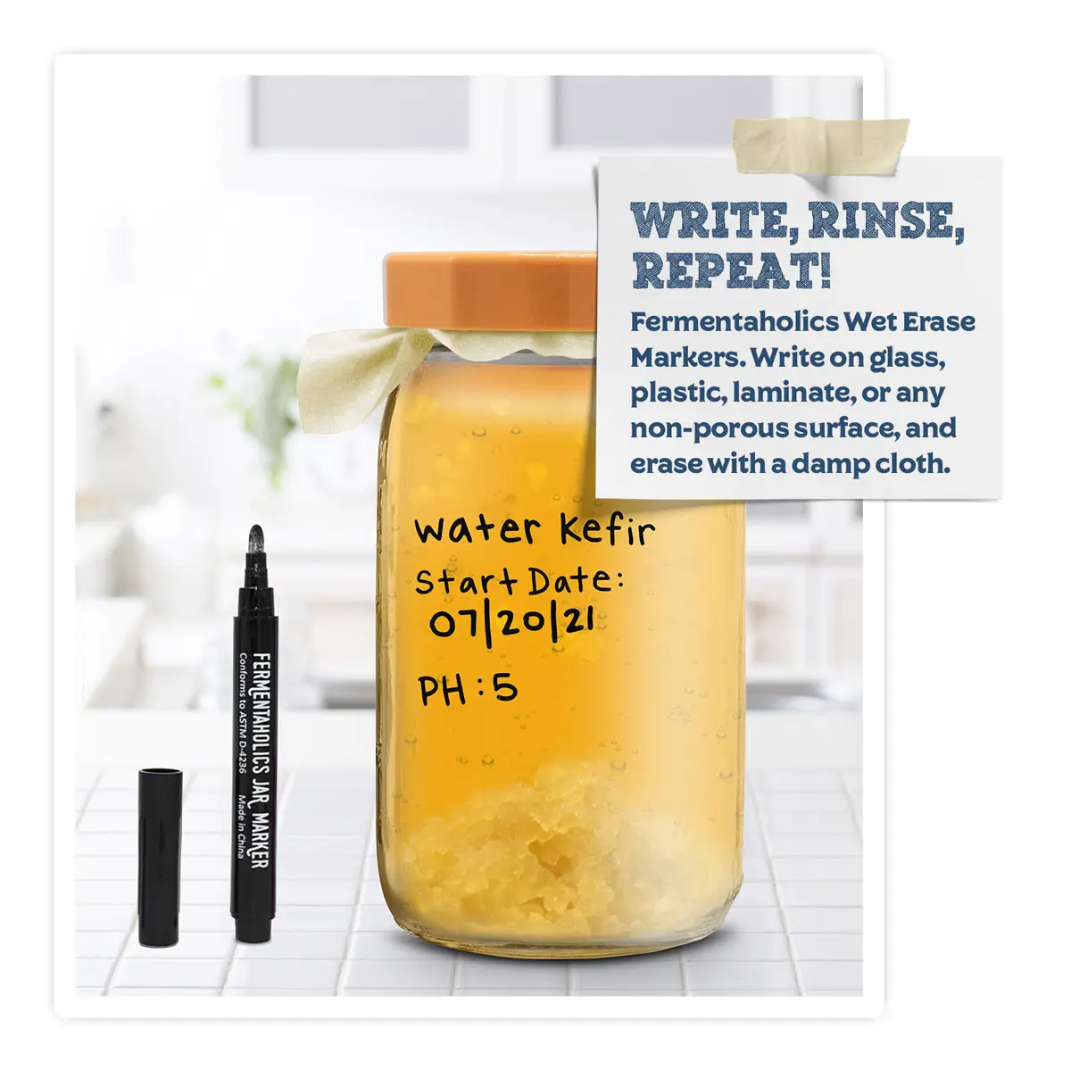 The washable water-based ink of Fermentaholics Jarkers means that no matter what you’re labeling – wine glasses at a party, a new Kombucha brew, or a batch of pickles – once you’re done, the ink will wash off easily so you’re ready for the next party and the next batch!