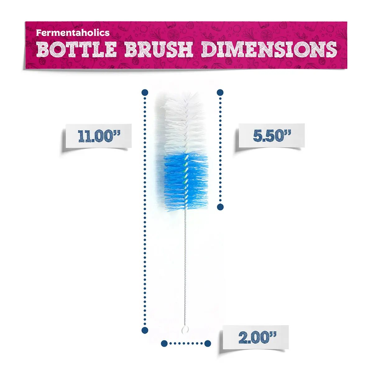 This 11″ brush is designed to clean bottles up to 9″ tall, including baby bottles, beer bottles, flip-top bottles, and kombucha jars. The 2″ wide scrubbing head provides excellent contact with the interior surface, so you get a more thorough clean with fewer strokes and less effort.