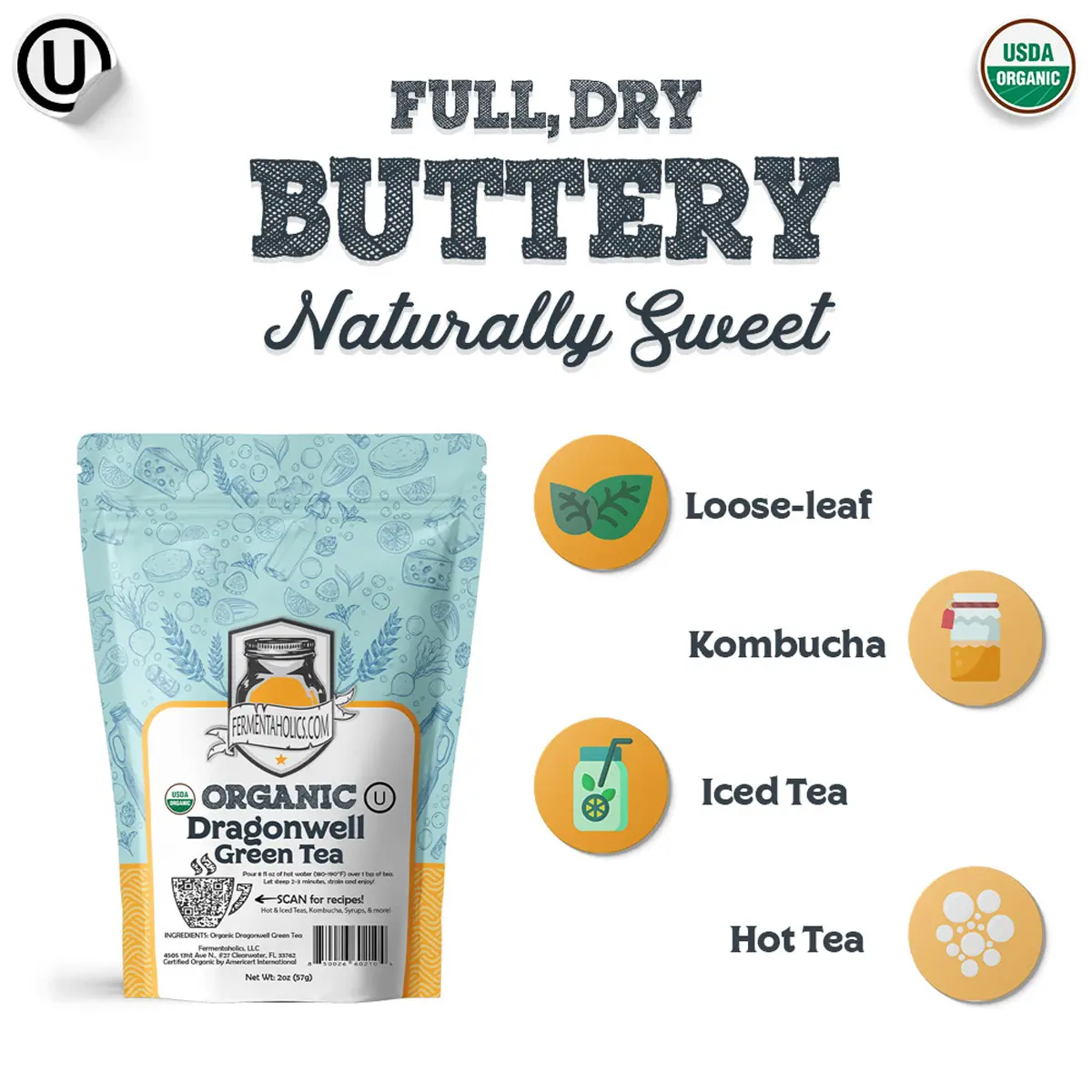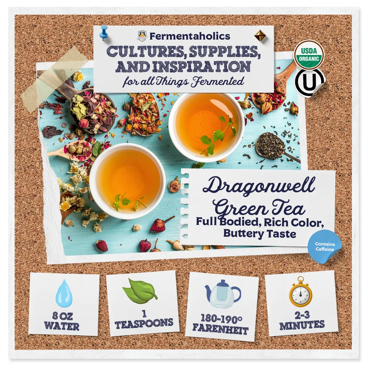 Organic Loose Leaf Dragonwell Green Tea is USDA Certified Organic and pesticide-free, sourced from premium organic farms. Perfect for brewing kombucha or enjoying as a hot, iced, or cold tea, this pack makes up to 11 gallons of kombucha. Made for kombucha brewers and certified OU Kosher, it ensures healthier SCOBY growth and exceptional flavor.