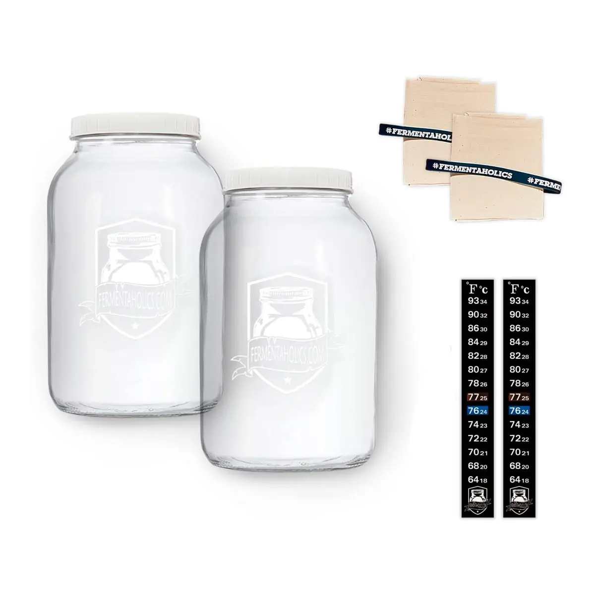 The Printed Gallon Kombucha Glass Jar 2 Pack is the ultimate setup for home brewers. Each 1-gallon American-made glass jar features printed brew notes and temperature ranges for easy tracking. Complete with muslin covers, rubber bands, temperature strips, and markers, it’s perfect for experimenting with different teas and sugars while providing a safe, non-porous home for your SCOBY.