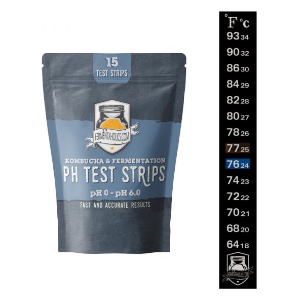 Testing the pH at the beginning of your brew is always a good idea to keep mold and unwanted bacteria out of your brew. Aim to start at 4.5 or below. Kombucha can have a pH anywhere from 2.5-3.8 depending on the stage of the brew, so testing it can hone in on you and your family’s personal favorite time to pull.