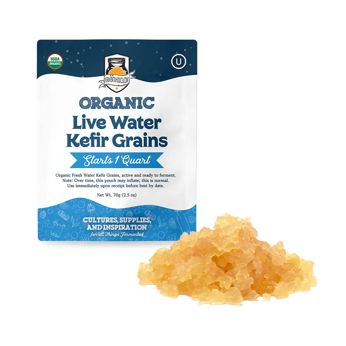 Fermentaholics water kefir grains are used to inoculate and ferment sugar water into a probiotic sparkling soda, known as water kefir. Make your own water kefir at home with our organic, live water kefir grains. Detailed instructions are included to get you started and guide you through each step of the process.