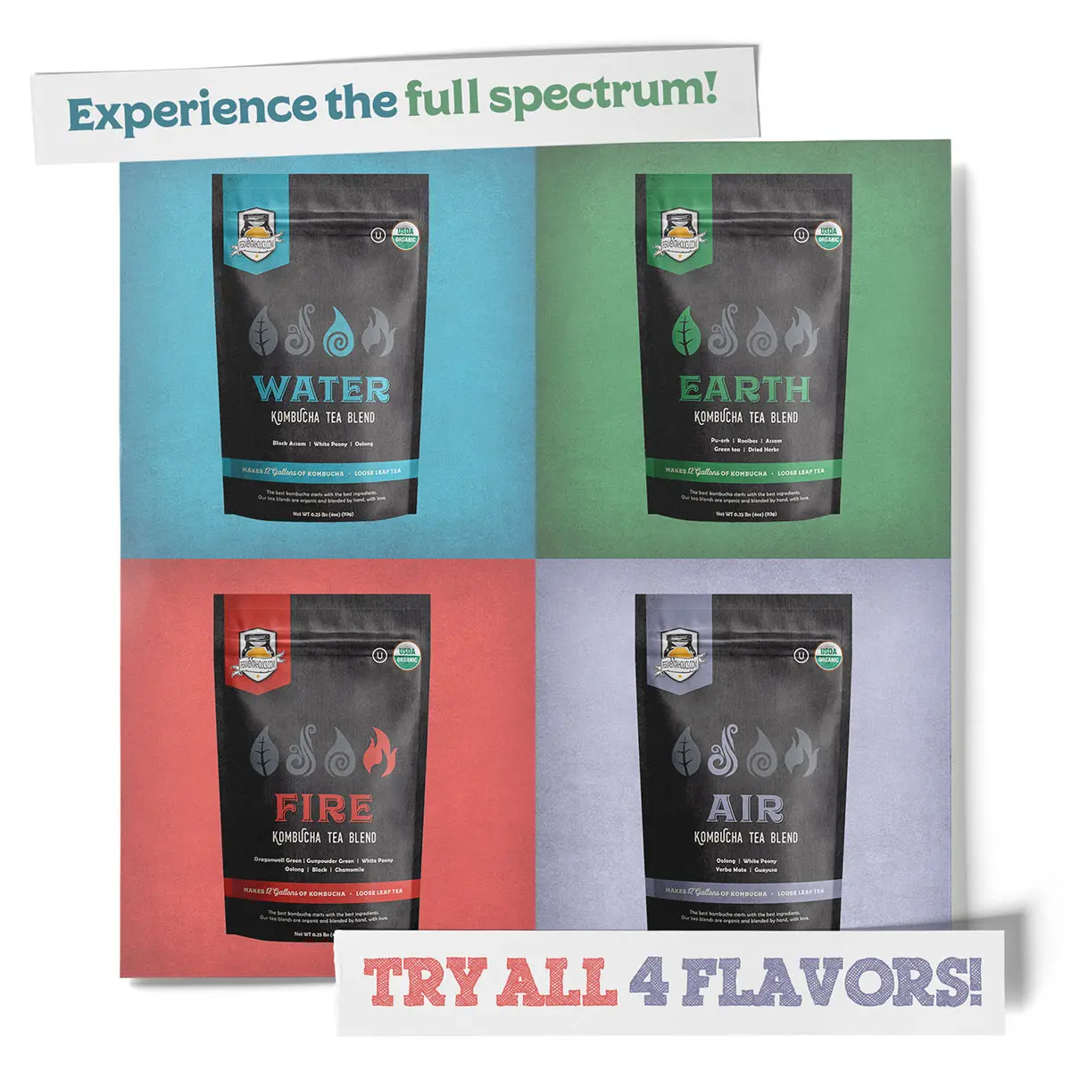 Each of our element tea blends is designed to benefit not only the brew and fermentation of your kombucha, but the overall final flavor as well. Blends of black, white, green, and herbal teas compliment spices and herbs all sourced to create a better, bolder brew.